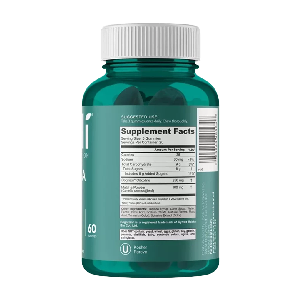 Fő összetevők: A gumi cukorkák természetes matcha porból és Cognizin® Citicoline-ból készülnek, amelyeket tapióka szirup, nádcukor, pektin és természetes aromák egészítenek ki.