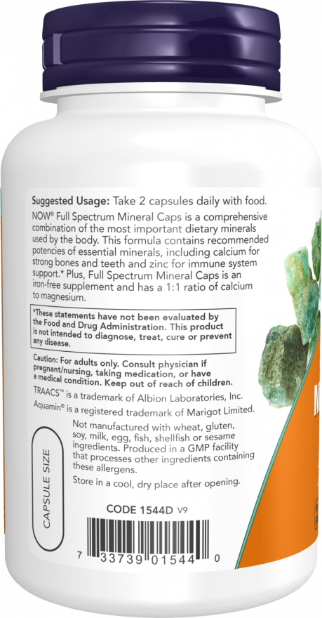 A NOW Foods Full Spectrum Minerals kapszulák könnyen használható formátumban kerülnek forgalomba, így nap mint nap egyszerűen alkalmazhatók.A vasmentes formulázás révén ideális választást nyújt azon felhasználók számára, akik vas nélküli ásványi anyag-kiegészítést preferálnak.