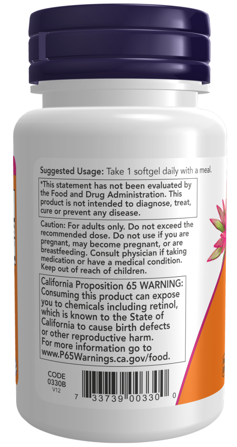 A NOW Foods Vitamin A terméke egy egyszerűen használható étrend-kiegészítő a mindennapokra. Készült természetes forrásból származó retinollal és béta-karotinnal,amelyeket halolajból nyernek ki. Minden egyes lágyzselatin kapszula 10.000 NE vitamin A-t tartalmaz.